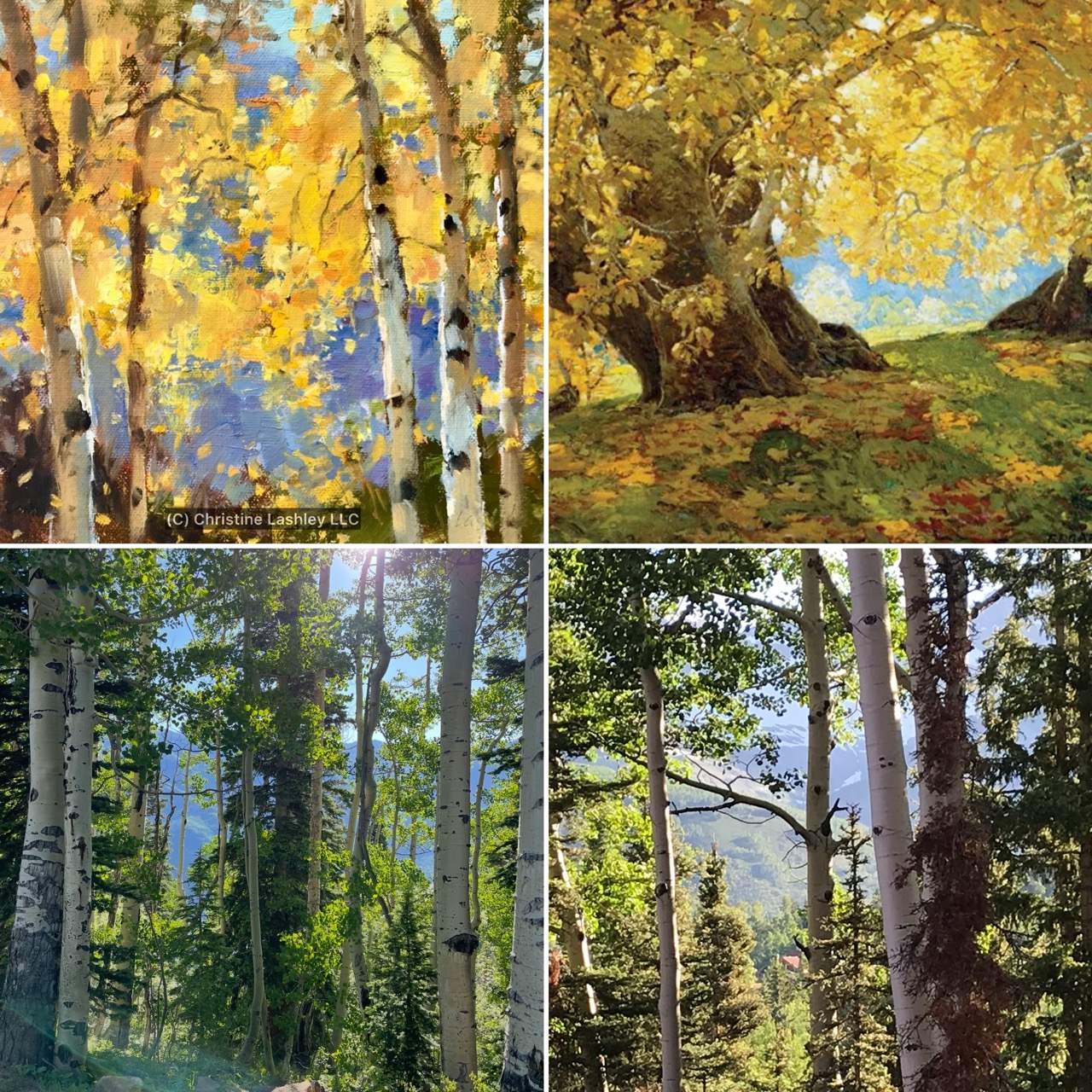 Look at the attached reference to give an idea of what we will paint. I show my art, Edgar Payne's art, and 2 photos for reference. Try to make a sketch of your idea or what you see. I kept the reference as a square but you may use any dimension of paper or panel (including square if you like). In the reference examples I like the look of the backlit trees. My tree limbs are dark and the foliage is glowing and light.